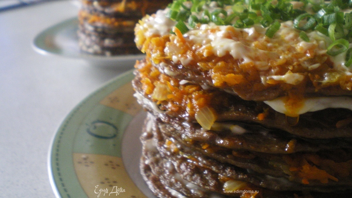 Собрать торт, промазывая каждый блинчик морковью с луком, затем чесночной заправкой. Украсить зеленью.