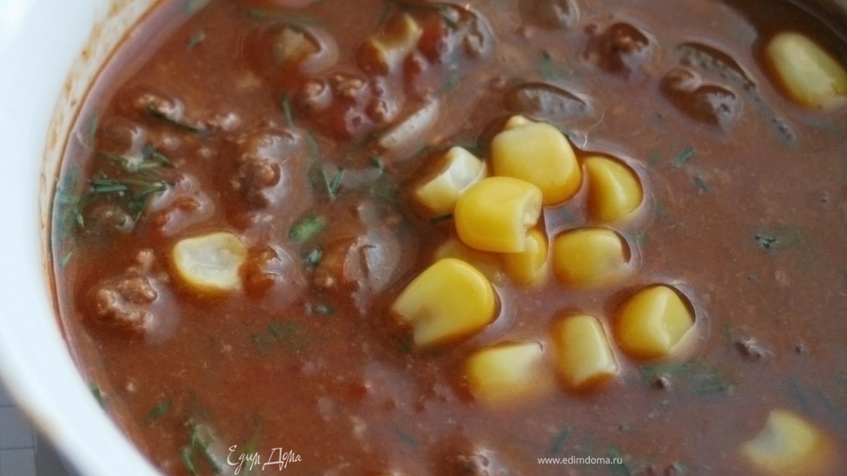 - Шаг 3Перекладываем в кастрюлю, вливаем кипяток около 500-700мл, солим и добавляем чили, имбирь, кориандр по вкусу. Довести до кипения, добавить шоколад и варить на очень маленьком огне 30 минут. Шоколад также добавляем по вкусу от 2 до 4 квадратиков. Посыпаем зеленью, можно украсить кукурузой.