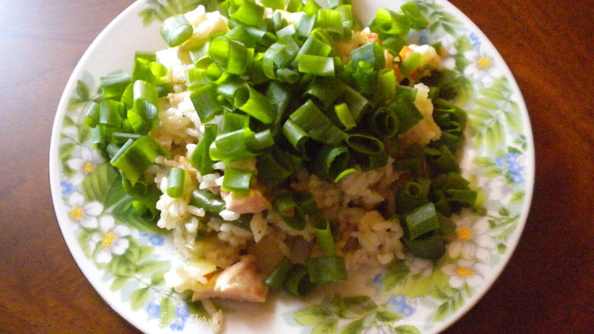 К этому блюду я приготовила простой овощной салатик и посыпала рис в порционных тарелках нашинкованным зеленым лучком только что собранным с грядки.