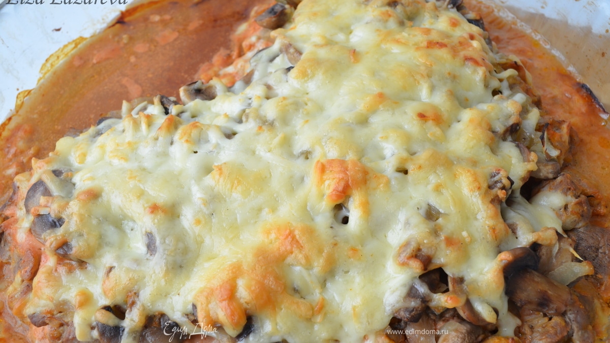 Затем все присыпаем тертым сыром и отправляем в духовку на 30 минут при температуре 200 градусов.