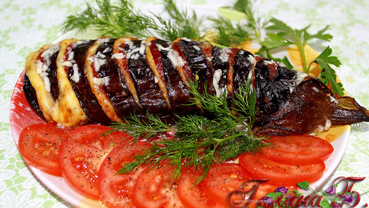 - Шаг 1Берем баклажанчик и разрезаем его поперек на сегменты в 1см, не более и не до конца. Солим, посыпаем специями по желанию, фаршируем кусочками колбаски с/к (сырокопченой) и твердого сыра (я брала Маасдам) Заворачиваем в фольгу, держим несколько минут завернутым, чтоб просолился, а потом ставим в духовку на 10 минут. Потом разворачиваем фольгу и допекаем до румяности минут 5-7. Вынимаем, снимаем фольгу, выкладываем на блюдо, поливаем чесночным соусом (можно просто посыпать тертым чесночком). Подать с помидорами и зеленью! Вкуснотища!