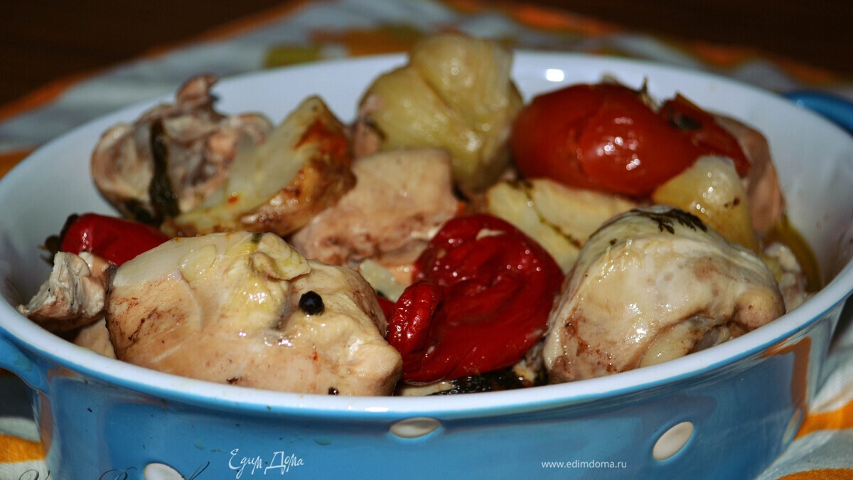 - Шаг 1Помидоры надрезать на попке крест на крест, лук почистить и нарезать на 4 части, корень сельдерея порезать полукольцами (толстыми кусками), перец и чеснок не чистить.