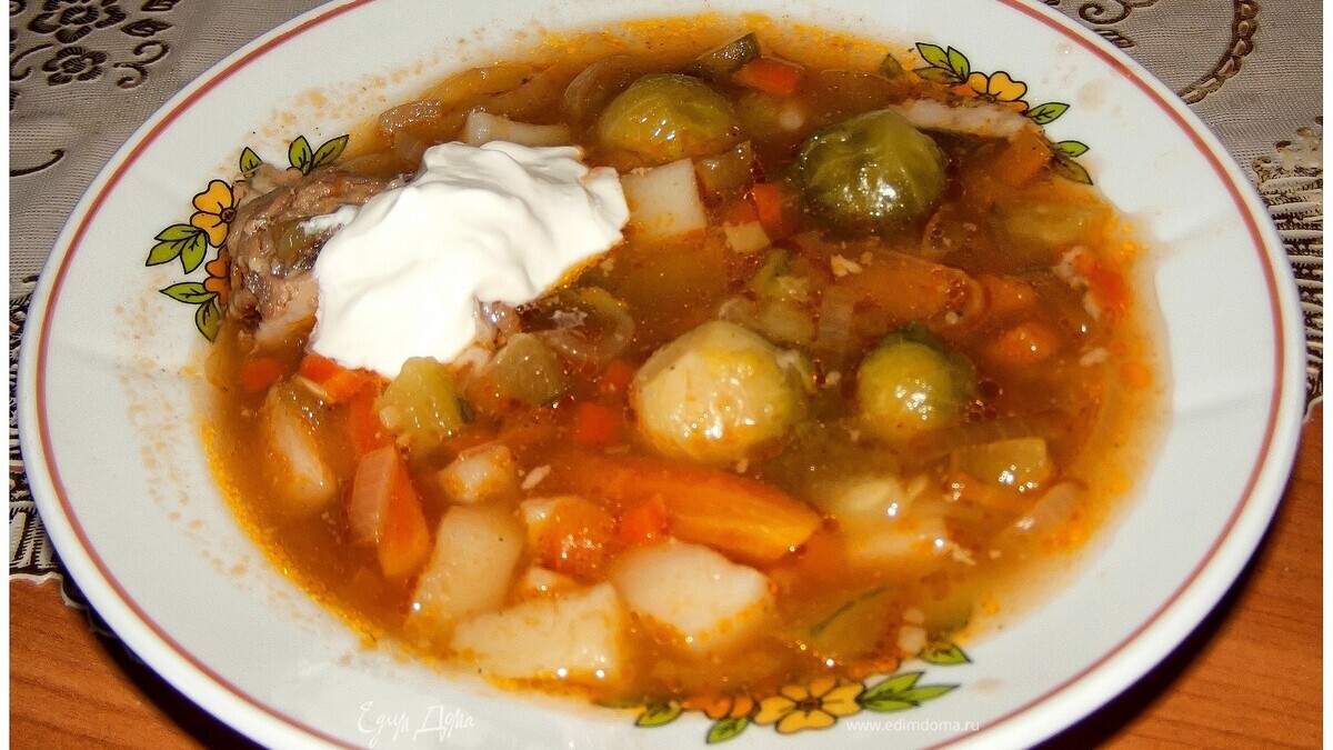 - Шаг 1Сварить бульон из говядины, по окончании варки добавить соль, черный перец горошком, брюссельскую капусту и нарезанные кубиками соленые или маринованные огурцы без кожицы. Брюссельскую капусту предварительно положить в кипящую воду на 1-2 минуты и откинуть на сито. Тем временем лук и морковь обжарить на растительном масле, положить в кипящий бульон, добавить картофель, нарезанный кубиками, томатную пасту, лавровый лист и варить до готовности при слабом кипении. По окончании варки при желании можно добавить свежую зелень – петрушку, укроп, зеленый лук. Подавать со сметаной.