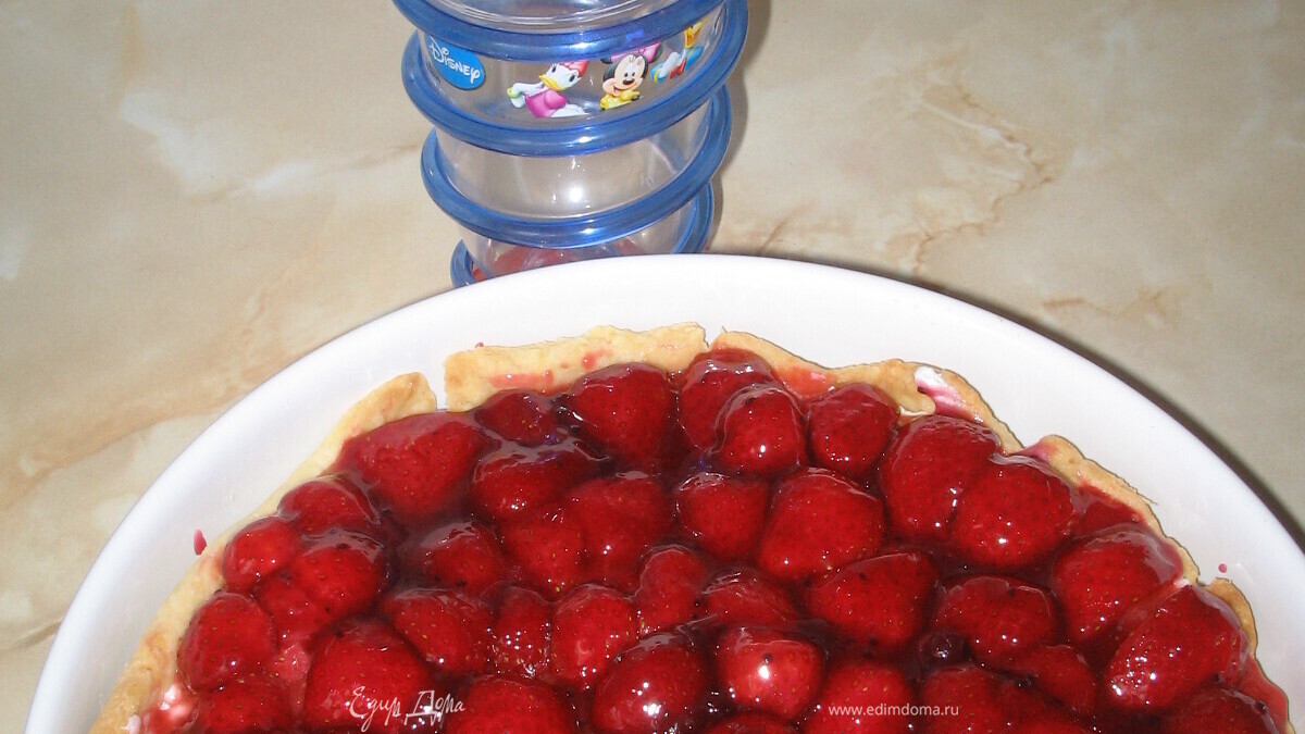 Начинаем собирать тарт:На тесто слой творожной массы,слой сваренной клубники.Сверху свежую клубнику порезанную на кусочки.