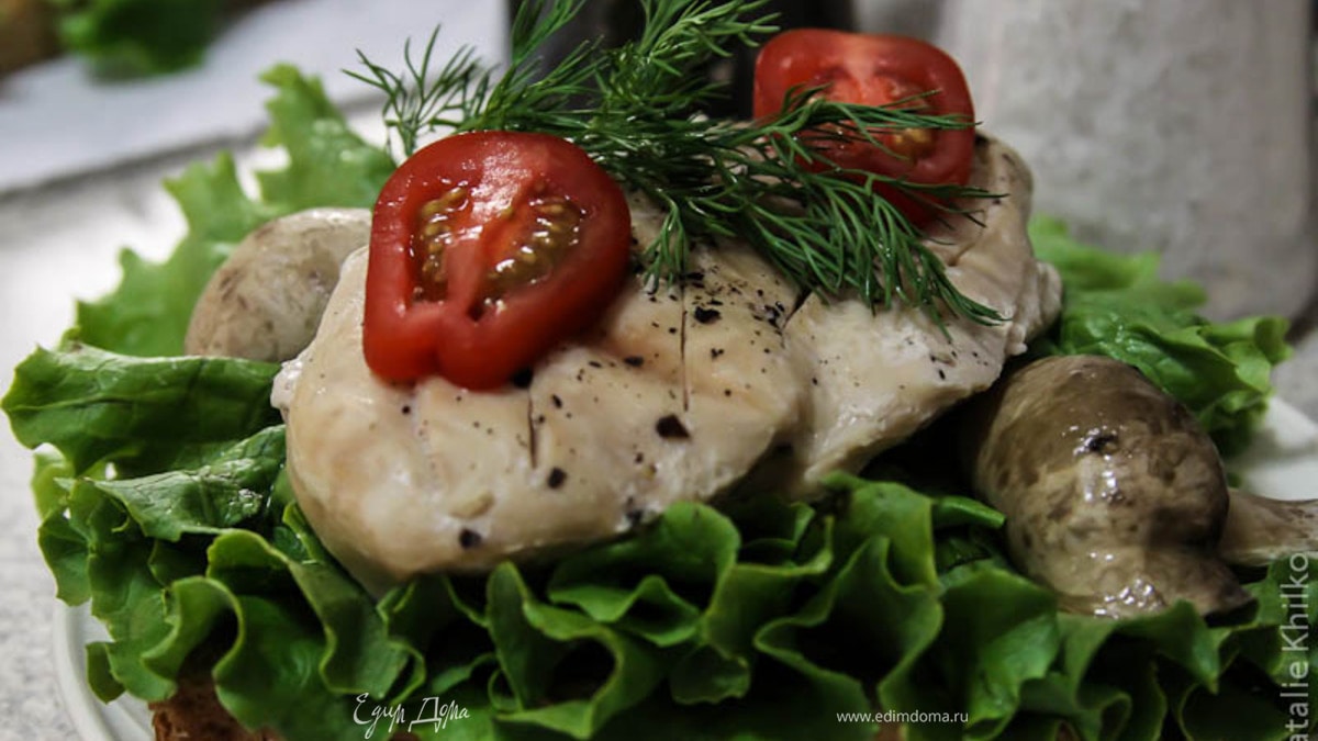 - Шаг 1Куриное филе можно запечь со специями и грибочек или обжарить. Делаем бутербродик: Хлебушек, горчичка или соус, листочек салата, разрезать помидорчик, грибочек, укропчик.