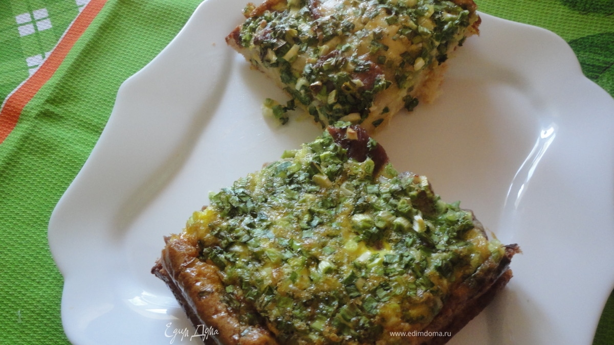 На свинину вылить яйца с зеленым луком. Поставить в разогретую духовку на 30 - 35 минут.