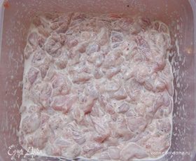В нарезанное мясо добавить соль, перец по вкусу. Влить сливки, столовую ложку горчицы положить. Я взяла ту, что была в холодильнике - Верес что ли, с добавлением хрена. Все хорошенько перемешать. Оставить на полчасика пропитаться.