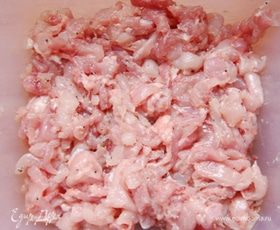 Домашние колбаски куриные ингредиенты Я взяла 1,2 кг куриных бедер (6 шт). Отделить мясо от костей и шкурки. С такого количества получилось всего 5 колбасок (где-то на 2 порции). Нам с мужем хватило на пробу, но вы пропорционально увеличивайте, если надо больше. С грудкой, конечно, мороки меньше, но я думаю, она суховата будет. Куриное мясо порезать мелко-мелко. Можно и перекрутить, но я больше люблю, когда кусочки мяса в колбасе.