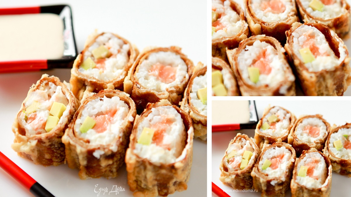 Горячий ролл из копченого угря со сливочным сыром и авокадо. Сервируется цитрусовым соусом "спайс".