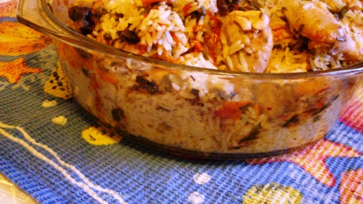 Рис промываем и высыпаем в форму для запекания. - Шаг 8Зелень мелко режем и высыпаем в форму. Солим, перчим, добавляем имбирь. Если имбирь свежий, его можно мелко порезать и обжарить с чесноком.