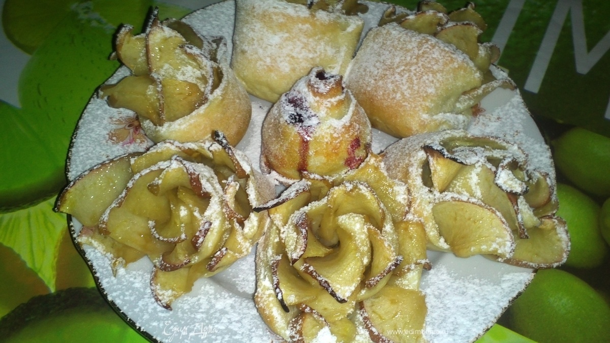 Чтобы получились бутончики розочек с жимолостью делаем следующее: полоску теста посыпаем сахаром,в середину полоски теста ровным рядком выкладываем ягоды и также закручиваем в рулетик,закрывая донышко,чтоб не вытек сок от ягод. Смазываем наши бутончики яйцом. - Шаг 4Ставим в разогретую духовку. Выпекаем при температуре 180-200градусов 10-15минут.
