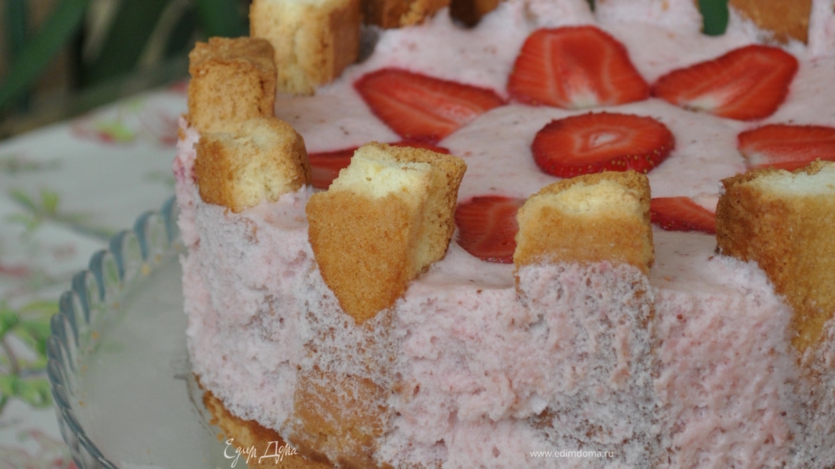 Смешать клубнично-желейное пюре и клубнику. Аккуратно подмешать сливки. Затем аккуратно, частями ввести белки. Вокруг бисквита надеть кольцо для торта. Пропитать сиропом. Выложить третью часть суфле. Вертикально по краям вставить бисквитные палочки. Выложить остальное суфле. Поставить в холодильник минимум на 4часа. - Шаг 7