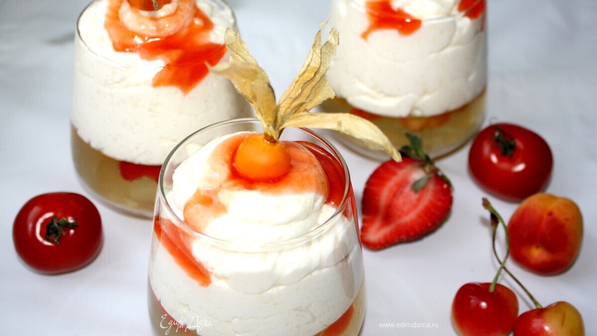 Винное желе с нежным рисовым муссом и томатно-ягодным соусом