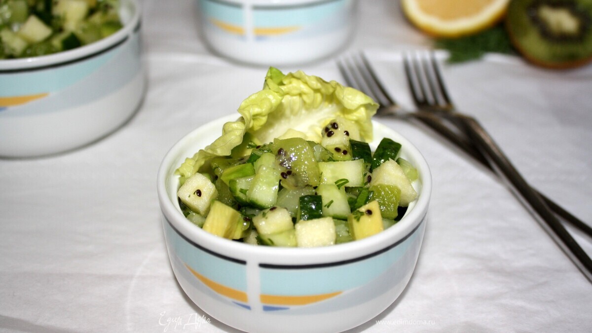 142-3 киви 1 зелёное яблоко 1 стебель сельдерея 150 гр огурцов 1 большой и очень спелый авокадо 2-3 стебля зелёного лука 5-6 веточек кинзы или петрушки Заправка: 1 зубчик чеснока 1 ст.л.лимонного сока 2 ст.л.оливкового масла соль