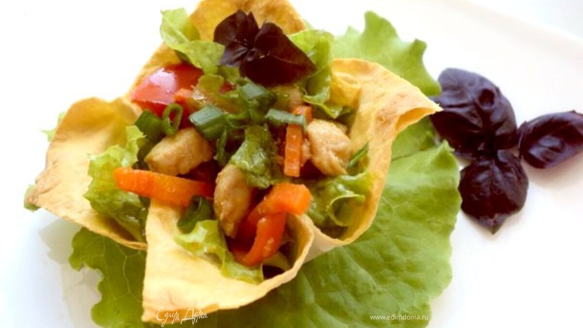 С начала конкурса «Экспериментируй с Tefal» каких только блюд не было приготовлено, но, кажется, еще не было салата. Вот и решила это исправить, представив на Ваш суд рецепт салата с курицей в апельсиновом соусе в оригинальных корзинках из лаваша. Рецепт авторский.