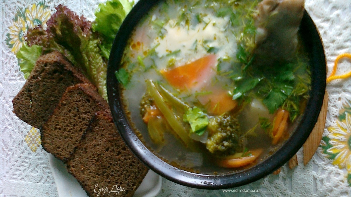 8. Разливаем суп по тарелкам, украшаем рубленой зеленью (оставшуюся отправляем в кастрюлю). Подавать с чесночными хлебцами и сметаной. Приятного аппетита!