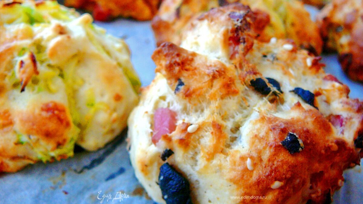 Пышное печенье "ассорти" с сыром, ветчиной, маслинами, кабачком и пореем