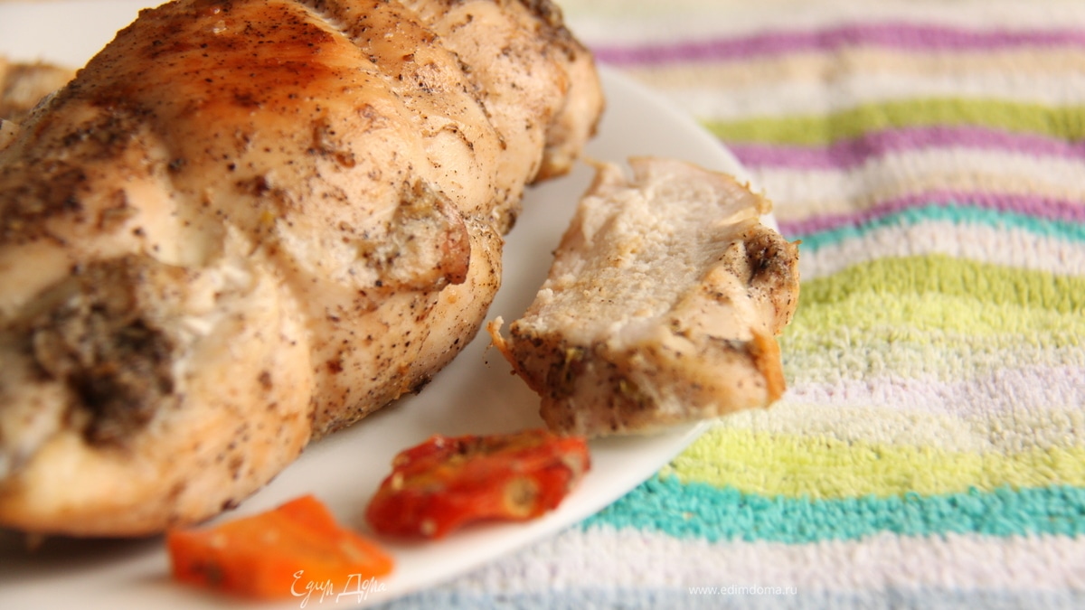 Вынимаем мясо из воды. Готовим смесь для обмазки: смешиваем выдавленный через чесноковыжималку чеснок с черным перцем, мускатным орехом, чайной ложкой соли и оливковым маслом. Обмазываем грудки, связываем их нитками для запекания попарно, положив внутрь морковь и помидоры. Кладем на противень, смазанный подсолнечным маслом. - Шаг 3Выпекаем при температуре 200 градусов в духовке 30 минут на одной стороне и ещё 15 минут на другой. Или в аэрогриле: решетка средняя, скорость вентилятора средняя, температура 235 градусов, 30 минут. Приятного аппетита! В качестве гарнира отлично подойдет отваренный рис.