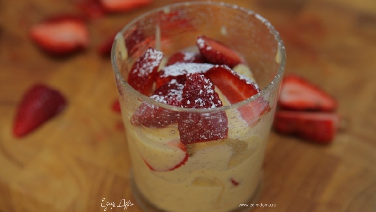 Готовый бисквит остудить, разрезать на небольшие куски, выложить в бокалы и влить понемногу крема, так чтобы бисквит пропитался, сверху добавить немного клубники. Затем опять бисквит, крем и клубника.