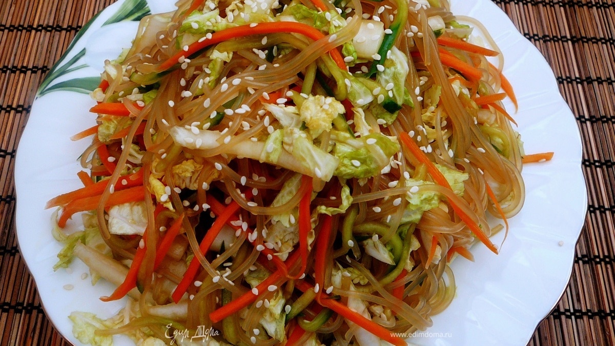- Шаг 1Яйца слегка взбейте и на сухой сковороде пожарьте 2–3 тонких омлетных блинчика. Охладите, сверните рулетом и нарежьте в виде тонкой лапши. Соедините с фунчозой.