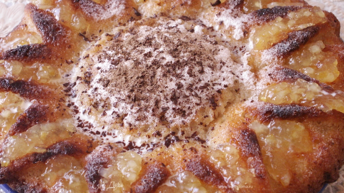 - Шаг 3Готовый пирог пропитала сливками, смешанными с ванильным сахаром. И, поскольку форма у меня в виде цветка, то в середину я посыпала немного сахарной пудры и тертой крошки горького шоколада. А лепестки смазала лимонно-имбирным джемом. Получилось очень вкусно! :)