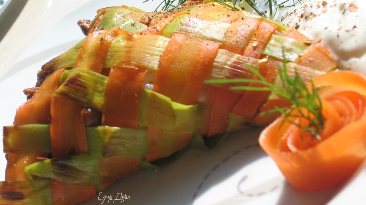Сплести плетенку из подготовленных овощей. Несколько советов: сначала следует разложить лук-порей, а затем от середины начать вставлять морковь. Для облегчения этой процедуры следует загибать от края к центру луковые ленты через один...на оставшиеся ленты положить морковную и вернуть все на свои места. так повторять еще и еще, каждый раз меняя четные и нечетные ряды луковых лент