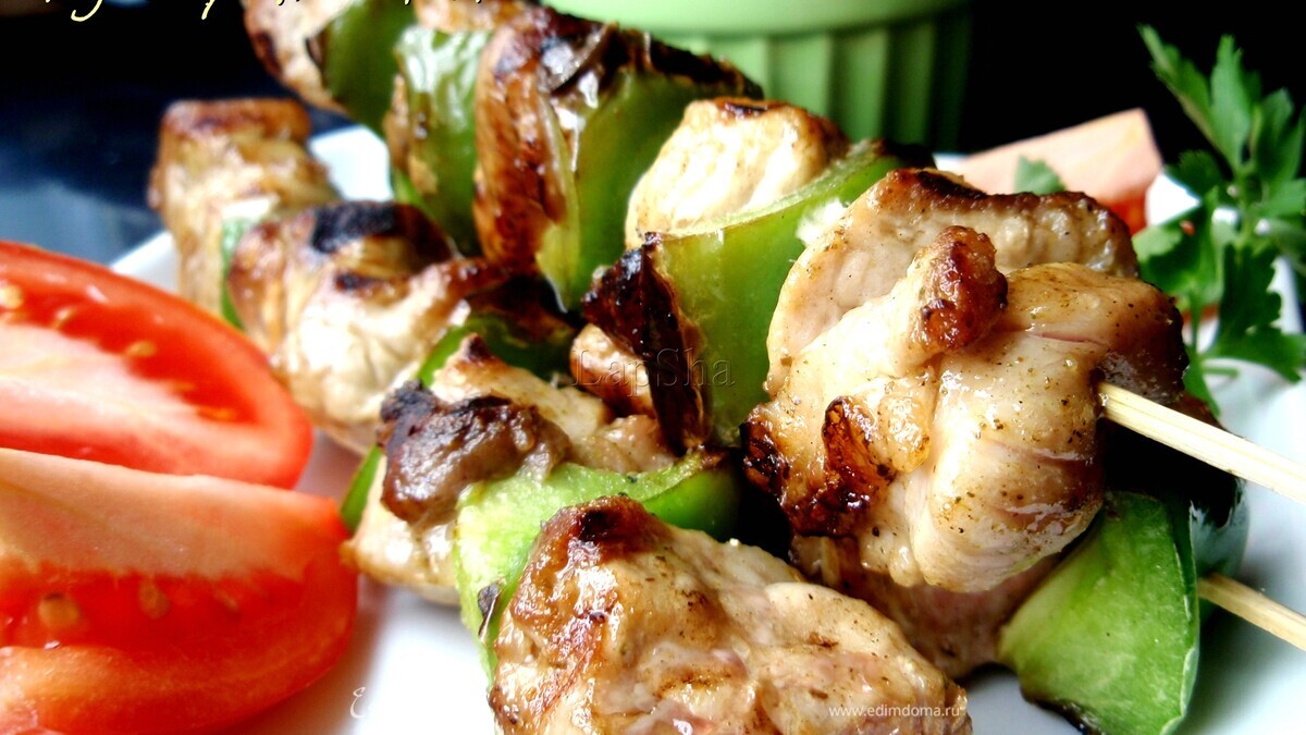 Если вы готовите так же как и я на сковороде гриль, то шпажки из дерева надо замочить в воде минут на 15, для того, чтобы они не пригорели во время готовки. Насаживаем на шпажки или шампура поочередно кусочки мяса и перца. - Шаг 2