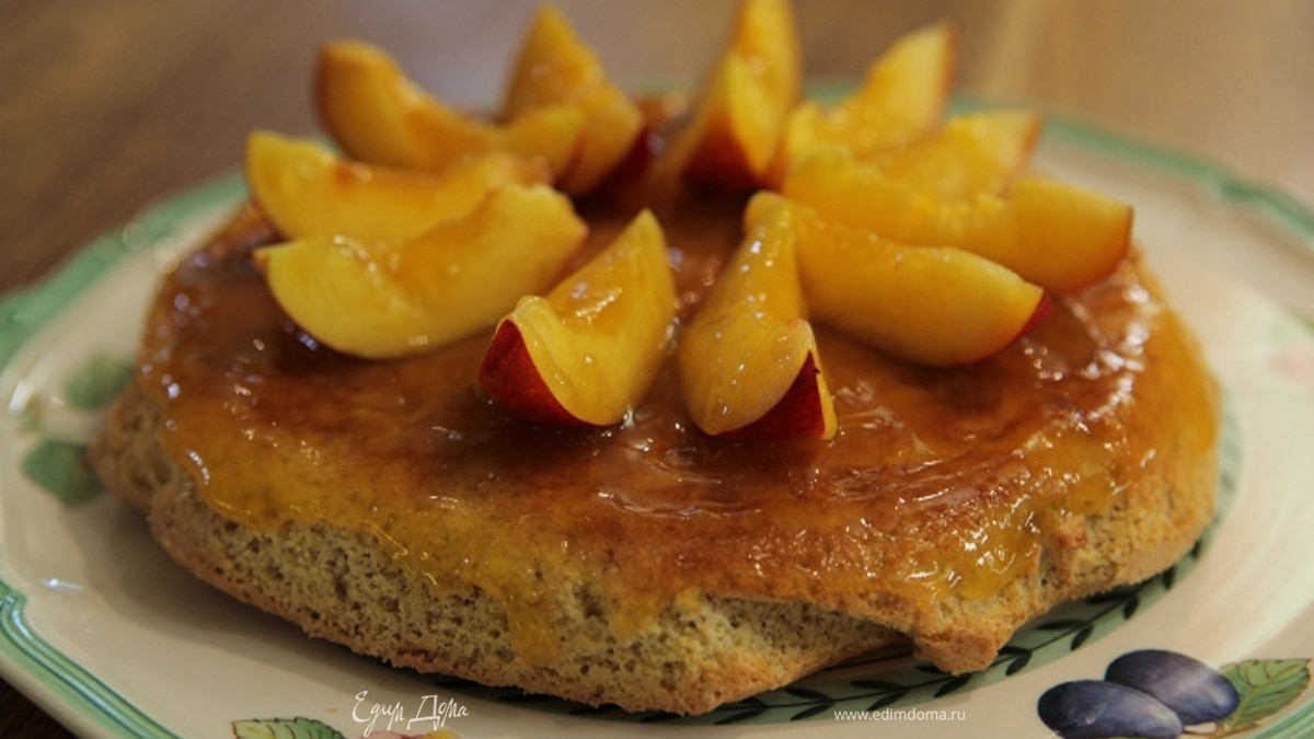 Готовый пирог выложить на тарелку, перевернув дном вверх, полить половиной сиропа, равномерно распределить его, выложить дольки нектаринов и полить оставшимся сиропом.