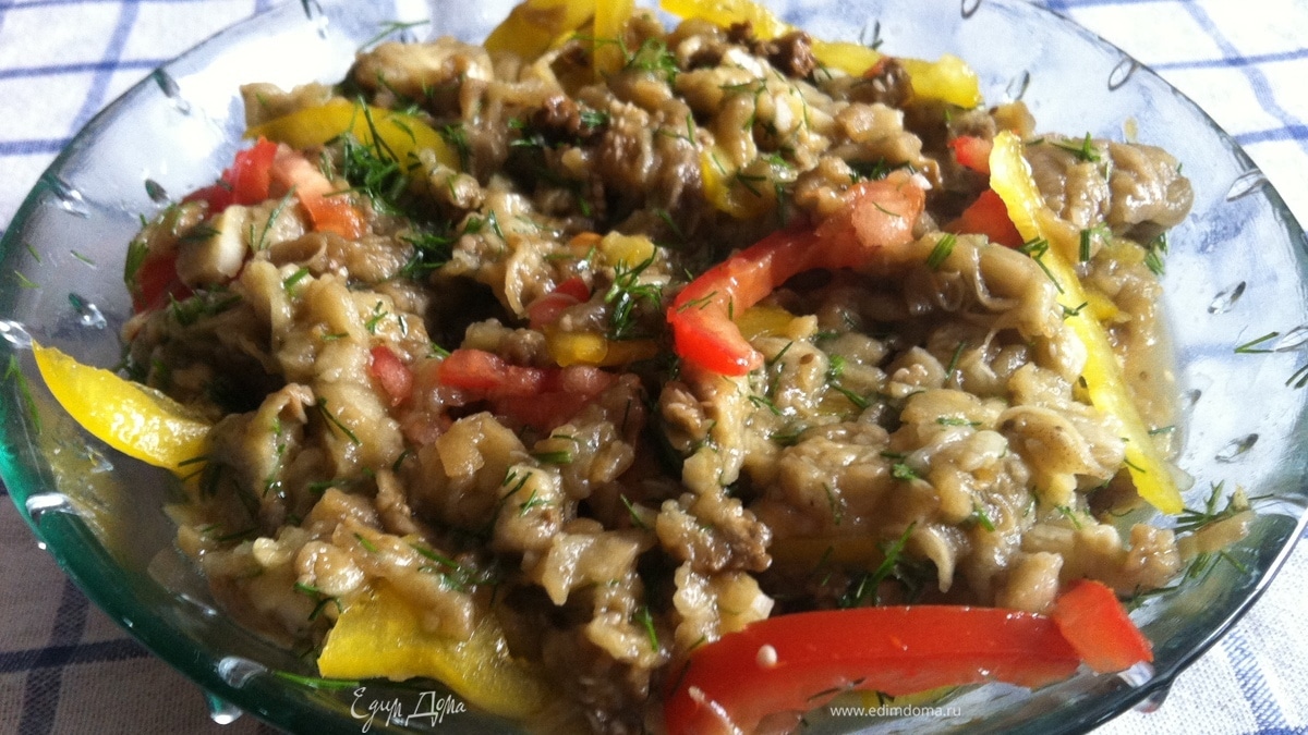 Салат из печеного баклажана и свежих овощей
