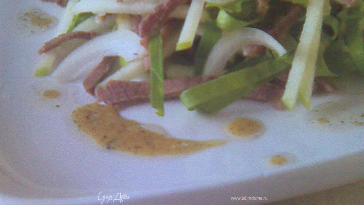 - Шаг 11. Говядину, салат, лук, соленый огурец и яблоко нашинкуйте соломкой. соедините. 2. Для заправки оливковое масло смешайте с сахаром, перцем, уксусом, горчицей и солью. 3. Заправьте все ингредиенты получившимся соусом