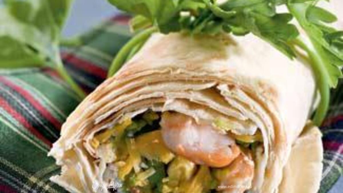 - ПодготовкаКукурузу разморозить. Чеддер натереть на мелкой терке, смешать с кукурузой. Смешать сливочный сыр с зирой. Авокадо очистить от кожуры, удалить косточку, мякоть размять вилкой, полив соком лайма, посолить. Креветки приправить маслом, солью и перцем, перемешать. Намазать лепешку сливочным сыром, затем слоями выложить креветки, авокадо и кукурузу с чеддером. Свернуть тортилью в рулет до середины, завернуть открытые бока внутрь и cвернуть лепешку до конца. При подаче разрезать поперек пополам. Этот рулет-сэндвич нужно съесть в течение 3–4 ч.