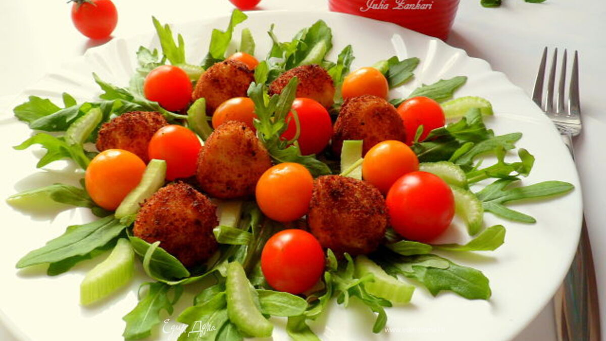 Поджаренная мини-моцарелла с овощами, руколой и натуральным йогуртом с мятой