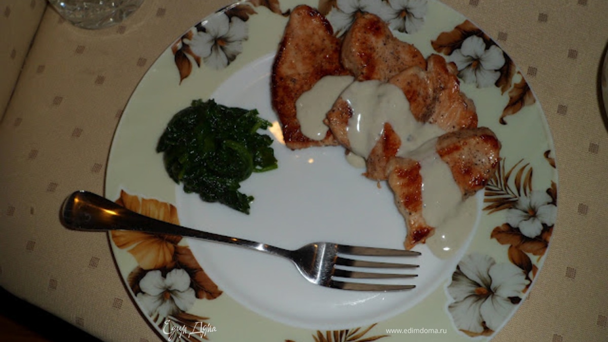 Выкладываем на тарелочку филе, рядом шпинат и поливаем соусом))))