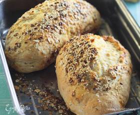 Когда тесто увеличится в объеме, вымесить его, добавить натертый сыр, финики и выложить в смазанную растительным маслом форму для выпекания кексов, присыпать кунжутными и льняными семечками, оставшимся геркулесом и поставить в теплое место еще на 10–15 минут.