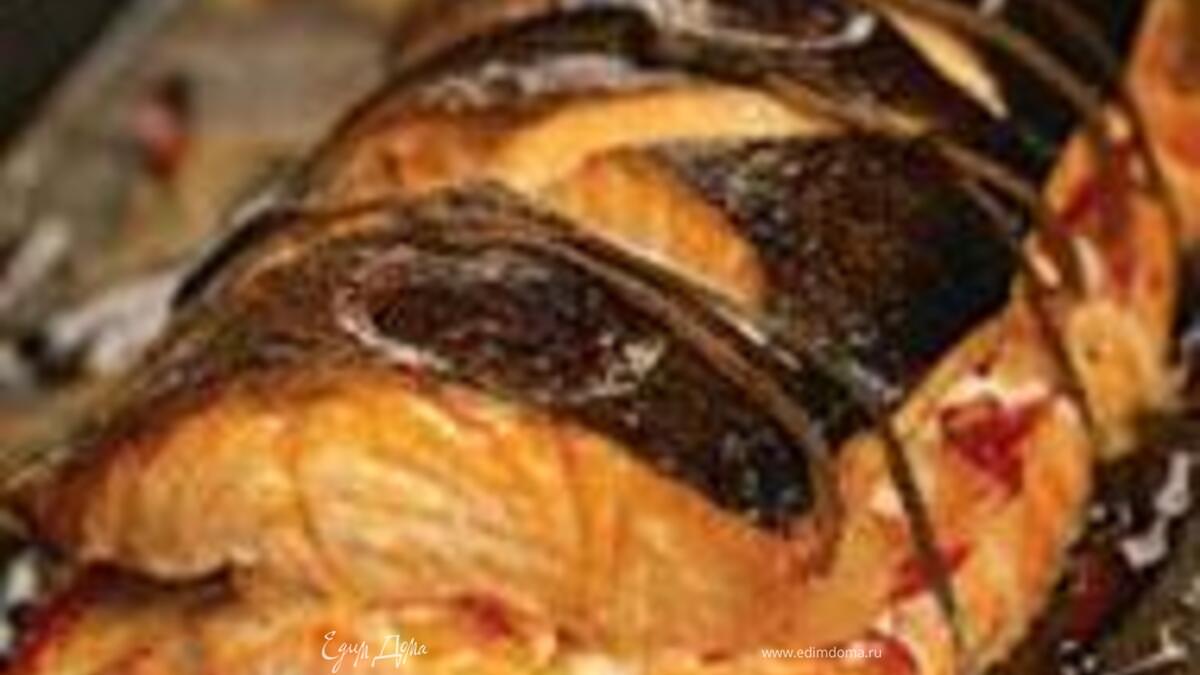 - Шаг 11. Лосося очистить, выпотрошить и тщательно промыть. Ножом сделать глубокий надрез вдоль хребта, немного раздвинуть мякоть и, делая небольшие подрезы вдоль ребер, разделить рыбу на 2 половины. Удалить хребет вместе с хвостом, а также плавники, реберные кости и все мелкие косточки. 2. Очень острым ножом сделать на коже одного филе глубокие крестообразные надрезы. 3. Приготовить начинку. Зеленый лук вымыть и нарезать по диагонали небольшими кусочками. Перец очистить от семян, промыть и нарезать тонкими полукольцами. Чеснок и имбирь очистить, измельчить. Креветки очистить, разрезать вдоль пополам. 4. В сковороде разогреть подсолнечное масло и обжарить лук, перец, имбирь и чеснок до мягкости, 3-4 мин. Влить сливки, размешать и готовить, пока смесь не загустеет. Добавить креветки, готовить 1 мин. Снять с огня, посолить по вкусу. 5. Кусок пергамента размером с противень положить на рабочую поверхность. Выложить на пергамент 4 отрезка бечевки, каждый по 30 см длиной, через равные интервалы. Сверху кожей вниз поместить кусок филе без надрезов. Ровным слоем распределить по рыбе приготовленную начинку. Посыпать лимонной приправой к рыбным блюдам. 6. Накрыть вторым куском филе, слегка прижать. Связать концы бечевок. Поставить противень в духовку и включить нагрев до 220°С. Аккуратно перенести пергамент с рыбой в духовку на разогретый противень. Готовить 30 мин. 7. В сотейнике разогреть лимонный сок с медом и соевым соусом. Готовую рыбу переложить на сервировочное блюдо, полить соусом, накрыть фольгой и дать постоять 5 мин. Затем подать к столу.
