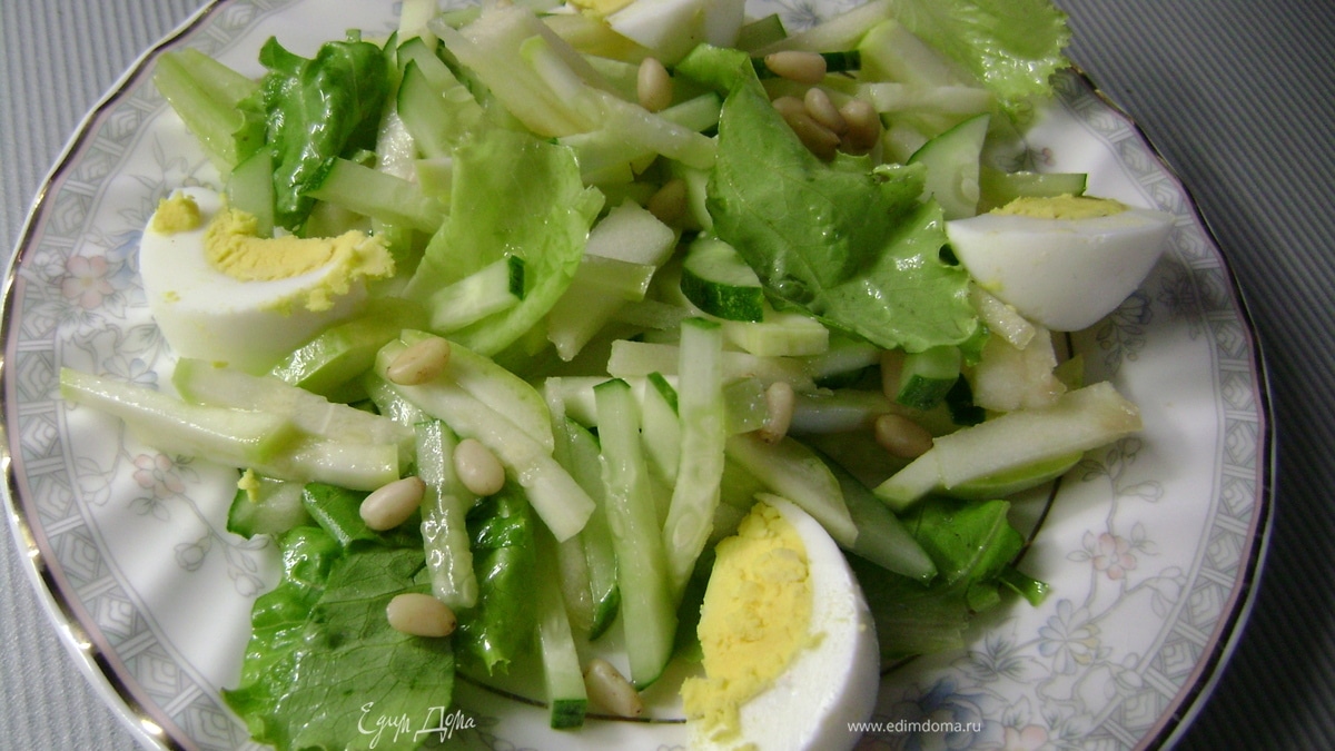 - Шаг 4Сверху разложить яйцо, порезанное дольками, и посыпать салат кедровыми орешками... ...приятного аппетита!!!