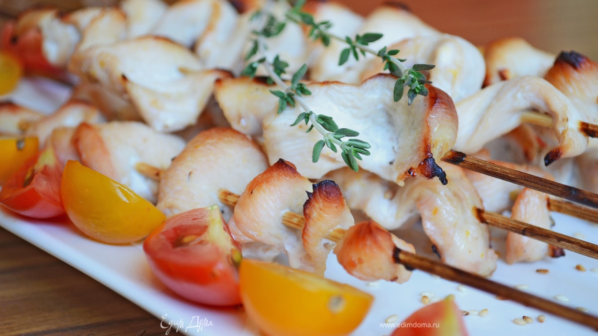 Крученая курица на шпажках в апельсиново-имбирном соусе