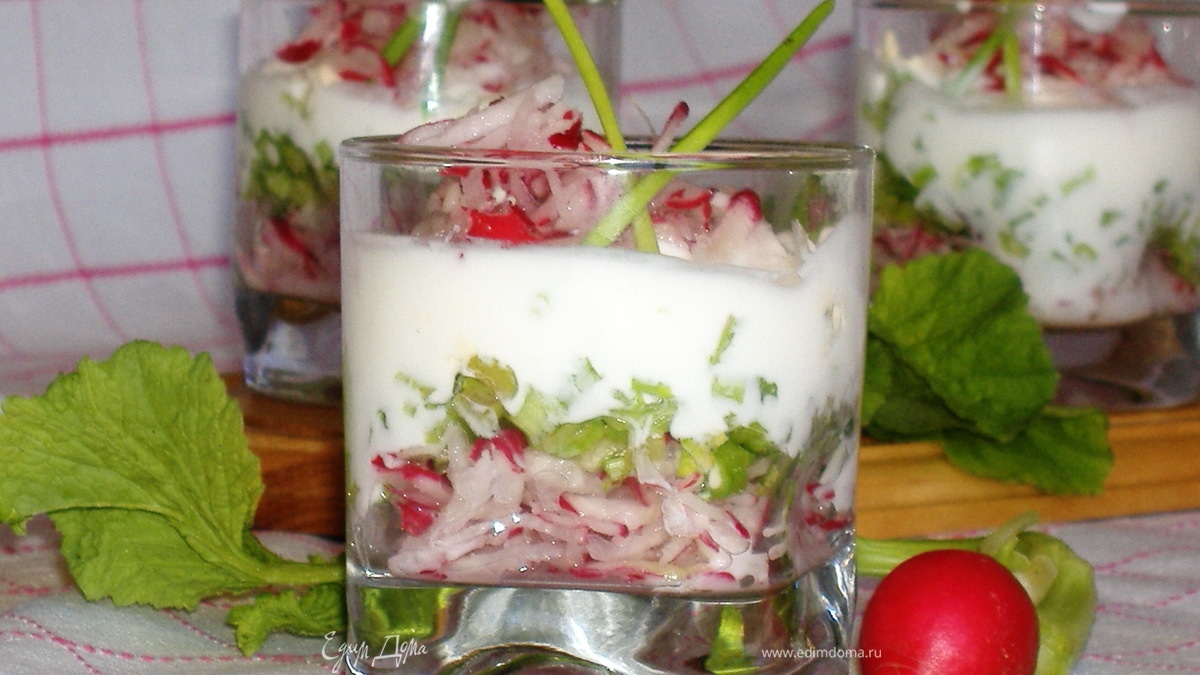 - Шаг 1В стаканы или креманки аккуратно выложить слоями: тертый редис (2 ст.ложки оставить для украшения), плавленный сыр и нарезанный колечками зеленый лук.