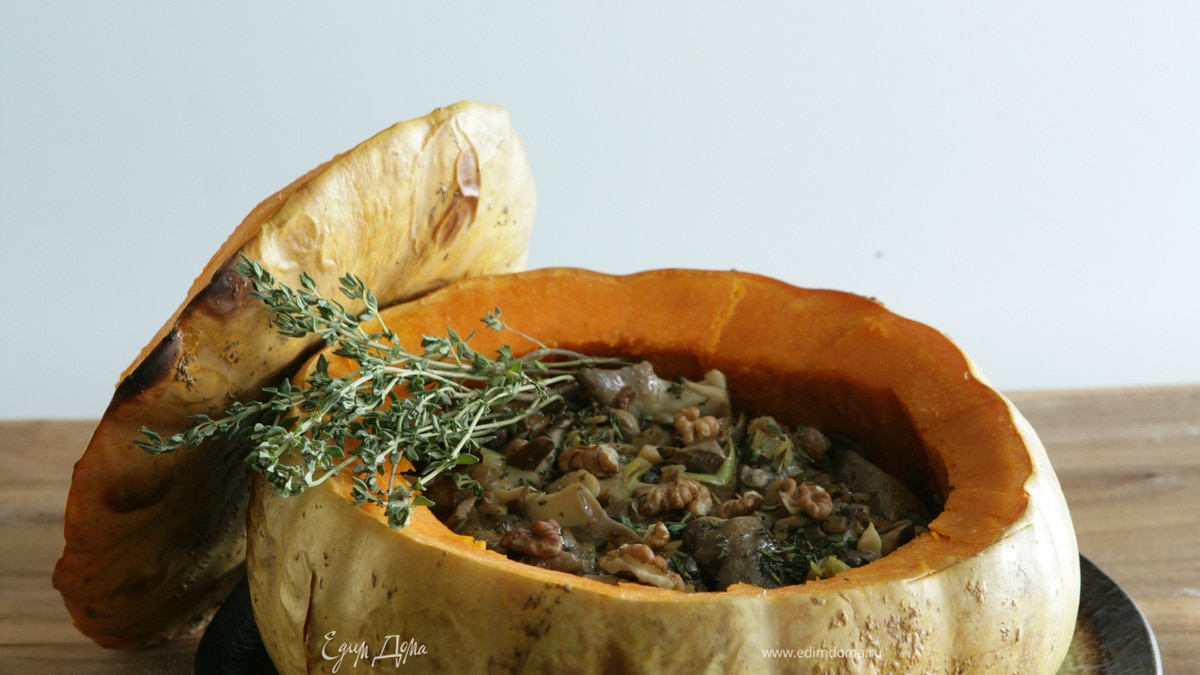 Запеченная тыква, фаршированная грибами и грецкими орехами