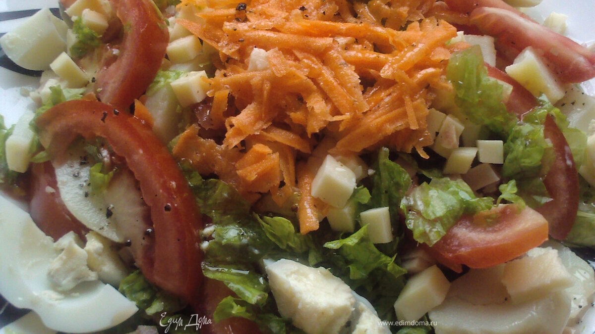 - ПодготовкаОтварите картофель и яйца. Вымойте и высушите салатные листья. Порежьте сыр и ветчину кубиками, картофель - кружочками, яйца и помидоры - четвертинками. Потрите морковь. Разложите ингредиенты в тарелки. Полейте содержимое каждой тарелки двумя столовыми ложками салатной заправки.