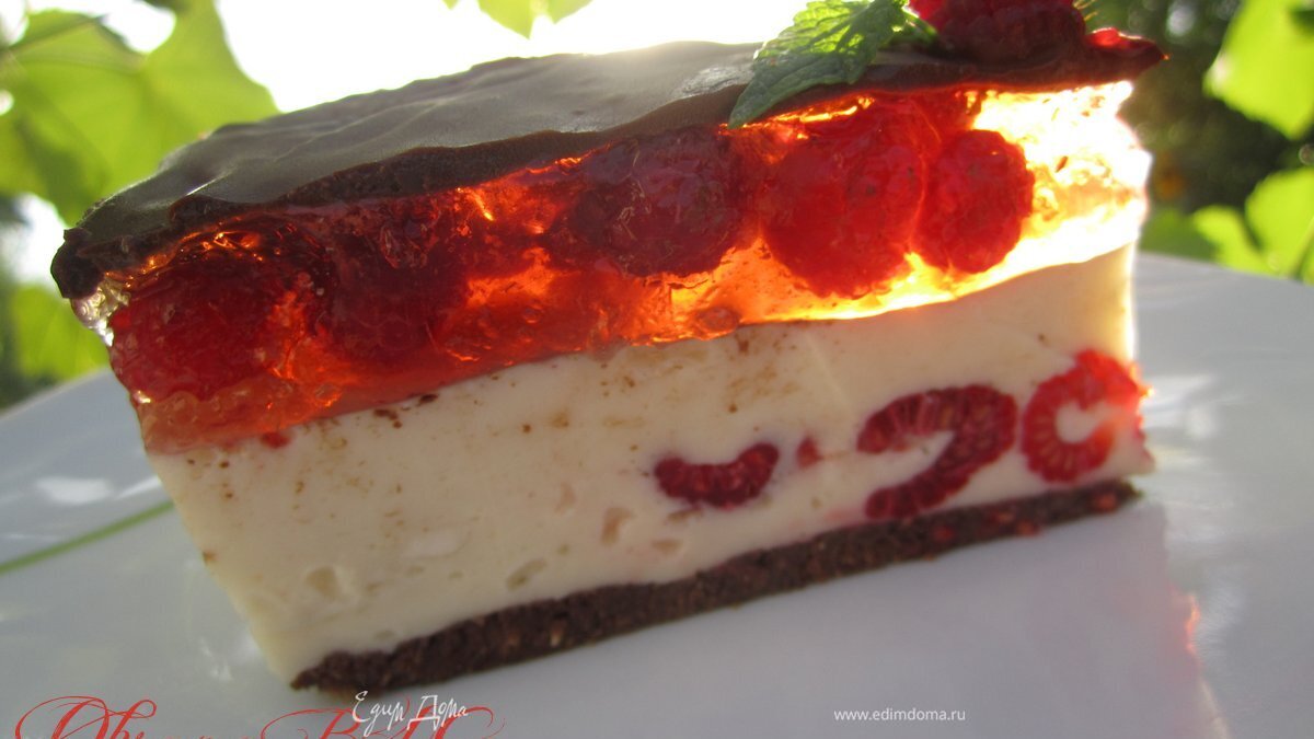 На корж вылить 1/2 часть крема, выложить 1/2 часть малины. Поставить на 5-10 минут в холодильник. - Шаг 9