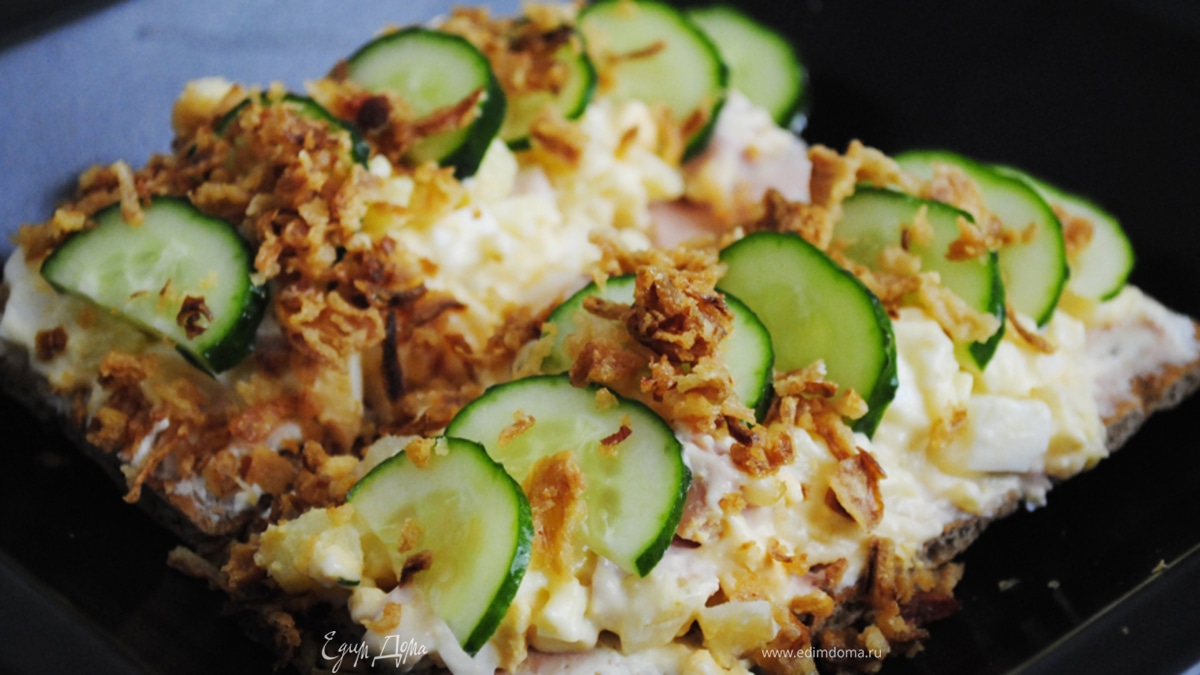 - Шаг 2Выложить массу с яичком и кукурузой на хлебец украсить огурчиком и посыпать луком!
