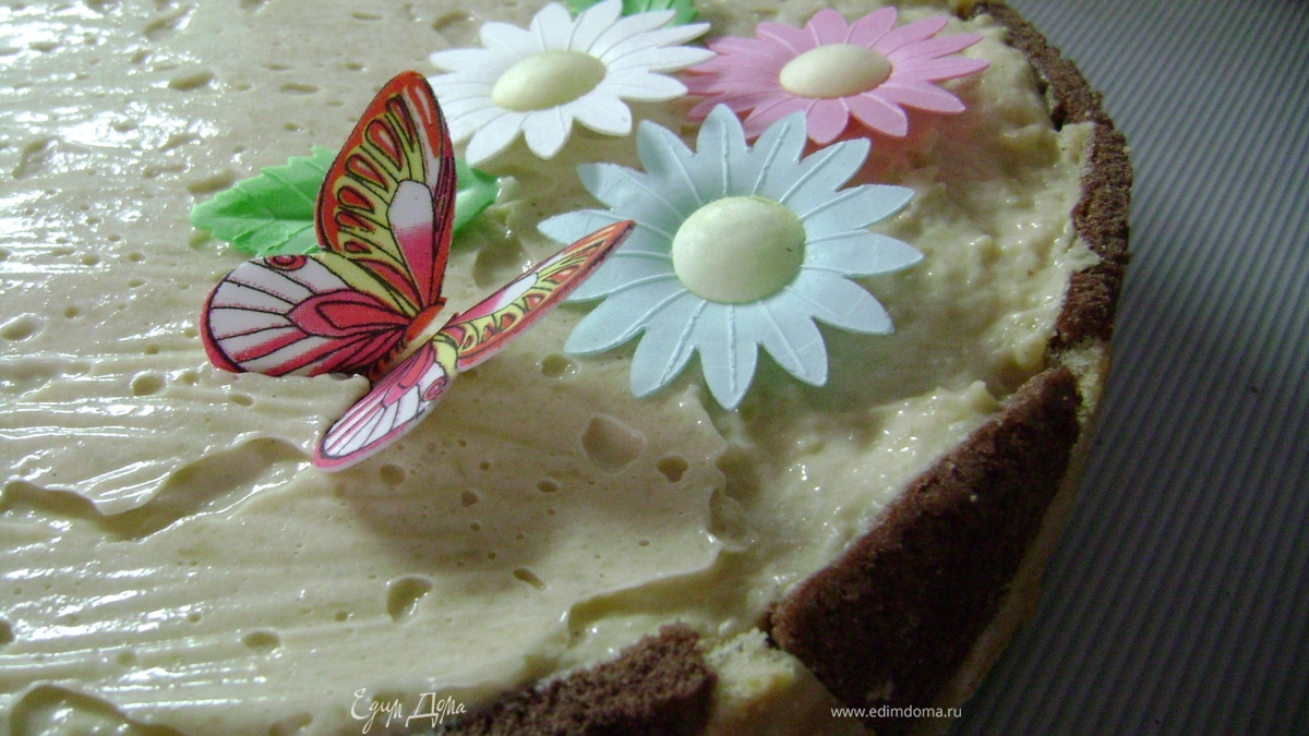 Снять кольцо с торта. Торт получился такой нежной структуры, что я побоялась его снимать с дна разъёмной формы, оставила прямо на нем. И ещё у меня полиэтилен немного прилип к поверхности торта, поэтому она не идеально гладкая, но на нежный вкус это никак не повлияло!