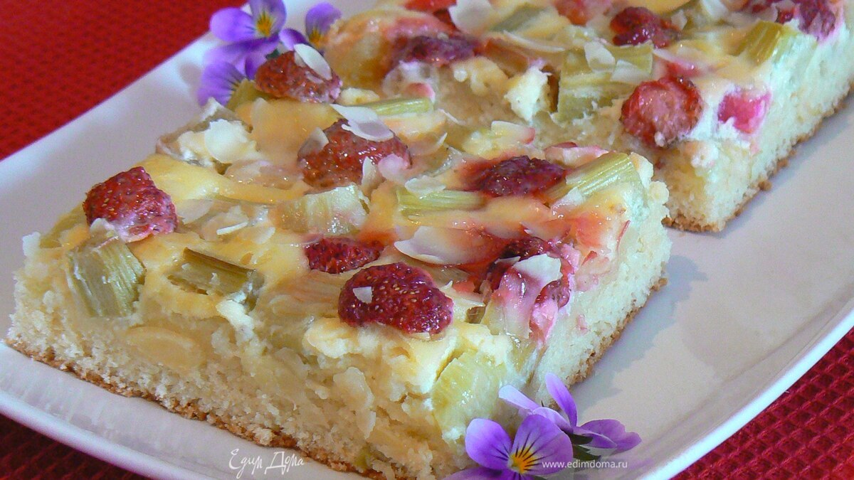 Приготовить заливку. Слегка взбить яйца со сметаной, сахаром и ванильным сахаром. - Шаг 6Тесто распределить руками по форме или противню, сделав бортики. Равномерно распределить ревень и клубнику.