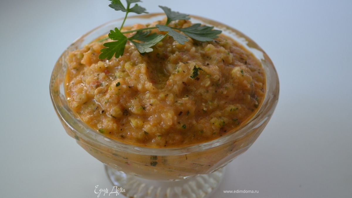 Овощи нарезать, цукини тонкими кружочками, перец очищенный напополам, лук и чеснок полукольцами, помидоры дольками, уложить на сковородку, полить маслом, посыпать специями и запекать при 200 гр 30-40 мин. Затем взбиваем на блендере. Оставляем остывать и настаиваться.