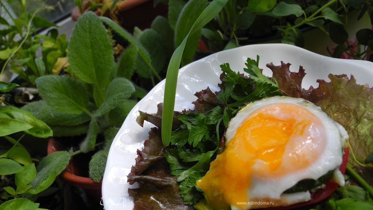 Кабачки нарезать кружочками толщиной 1-1,5 см. Вырезать серединку, посолить. Обжарить на оливковом масле с одной стороны (там, где выемка). Перевернуть, посыпать кунжутом и разбить яйцо в выемку. Подержать на огне ещё несколько минут, пока белок не схватится. - Шаг 2Затем сборка. На "постель" из салатных листьев положить несколько веточек петрушки (можно любую зелень), кружочек помидора, а сверху уложить кабачок с яйцом. Для молоденьких кабачков лучше использовать перепелиные яички, будет смотреться ещё интереснее.Приятного аппетита и хорошего дня!