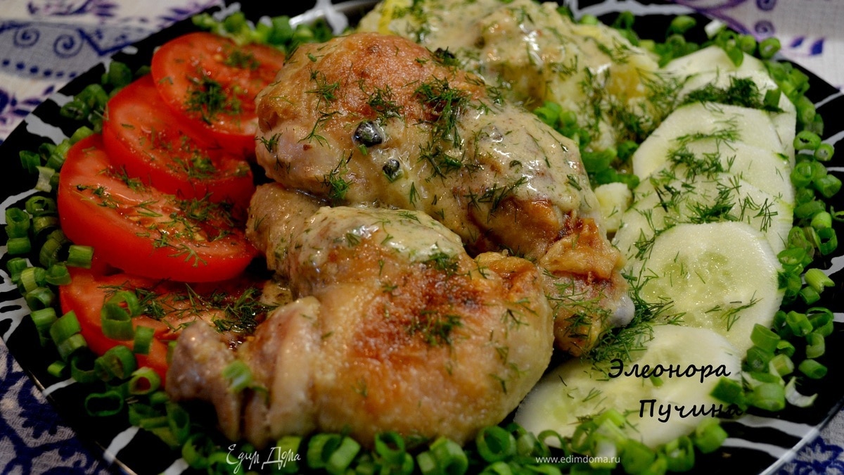 В это время отвариваем картошку. В сливки из-под окорочков добавить сыр и мелко порезанный укроп. Готовой подливкой полить картошку и окорочка. Подала с огурцом и помидором, посыпать зеленью.