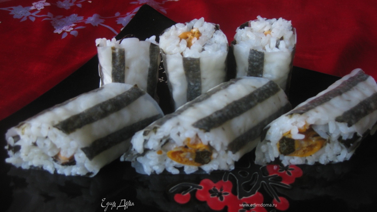 - ПодготовкаРис промыть холодной водой 5-7 раз, пока вода не станет прозрачной. Откинуть рис на сито, затем выложить в кастрюльку и залить 0,75 стакана горячей кипяченой воды, накрыть крышкой и варить на самом маленьком огне 10 минут. Отваренный рис снять с огня и оставить еще на 10 минут под крышкой, чтобы он пропарился. Приготовить заправку, смешав 1 ст.ложку горячей кипяченой воды, сахар, соль и уксус. Рис выложить в миску, залить заправкой и аккуратно перемешать. Дать рису немного остыть.