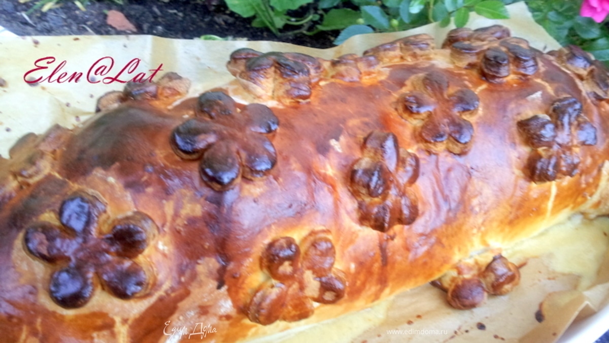 Из теста можно вырезать цветочки, листочки все что душе угодно и украсьте Ваш рулет.Но перед тем как украшать выложите его швом вниз на противень застеленный пергаментом