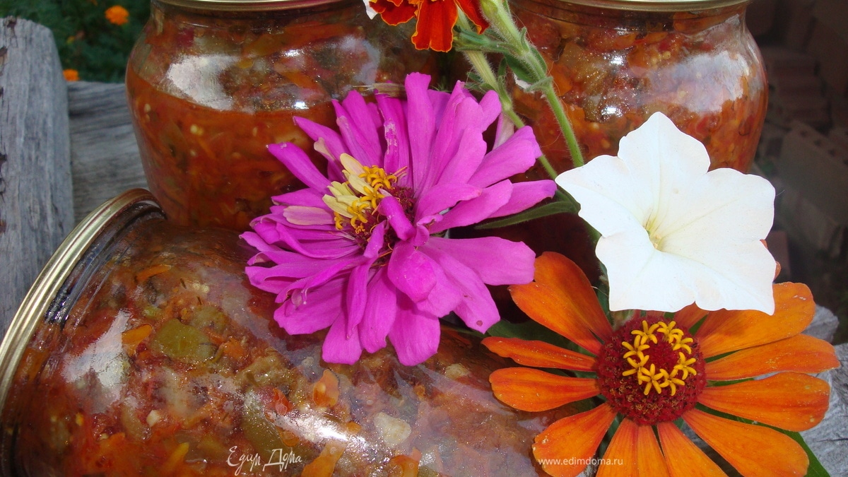 Приготовьте маринад из измельченых томатов, сахара, соли, растительного масла. Доведите до кипения. - Шаг 2Положите в него все измельченные овощи и кипятите 40–50 минут. За 10 минут до окончания добавьте чеснок, зелень и уксус.